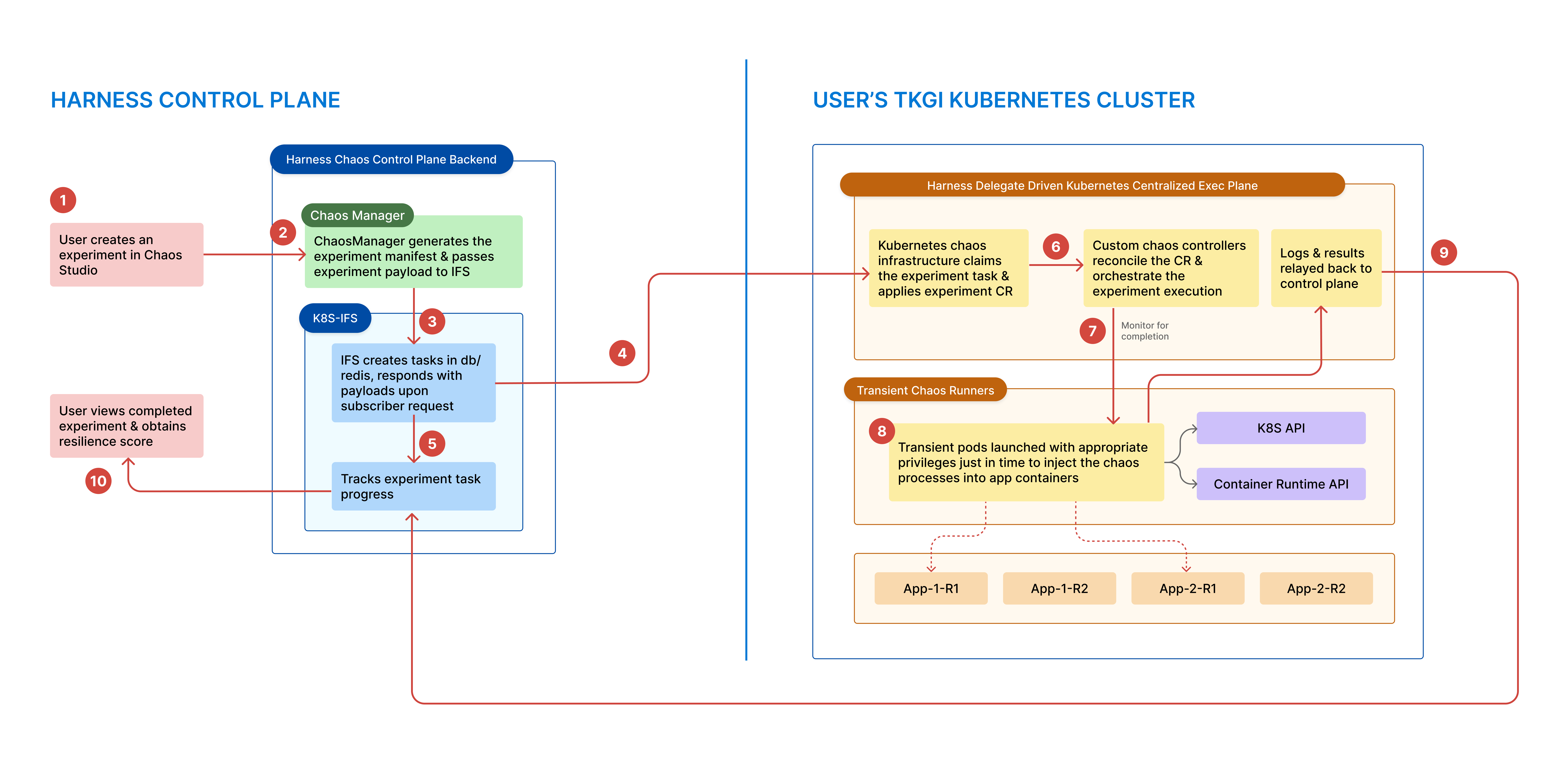 When you create a Kubernetes experiment with the target details, the fault tunables, and the probes, the following actions take place: