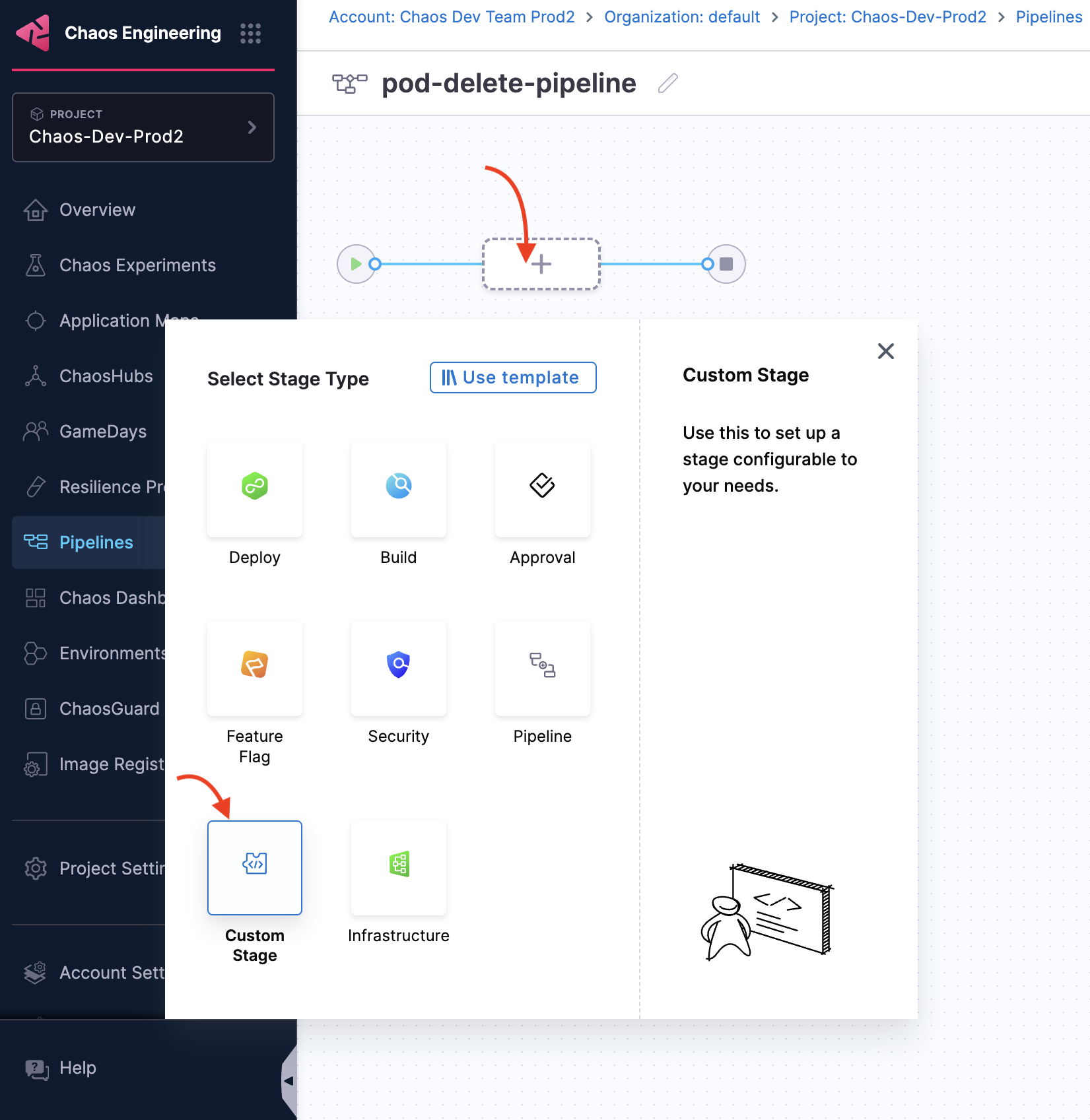 1. Go to Chaos module and select Pipelines and click +Create a Pipeline.