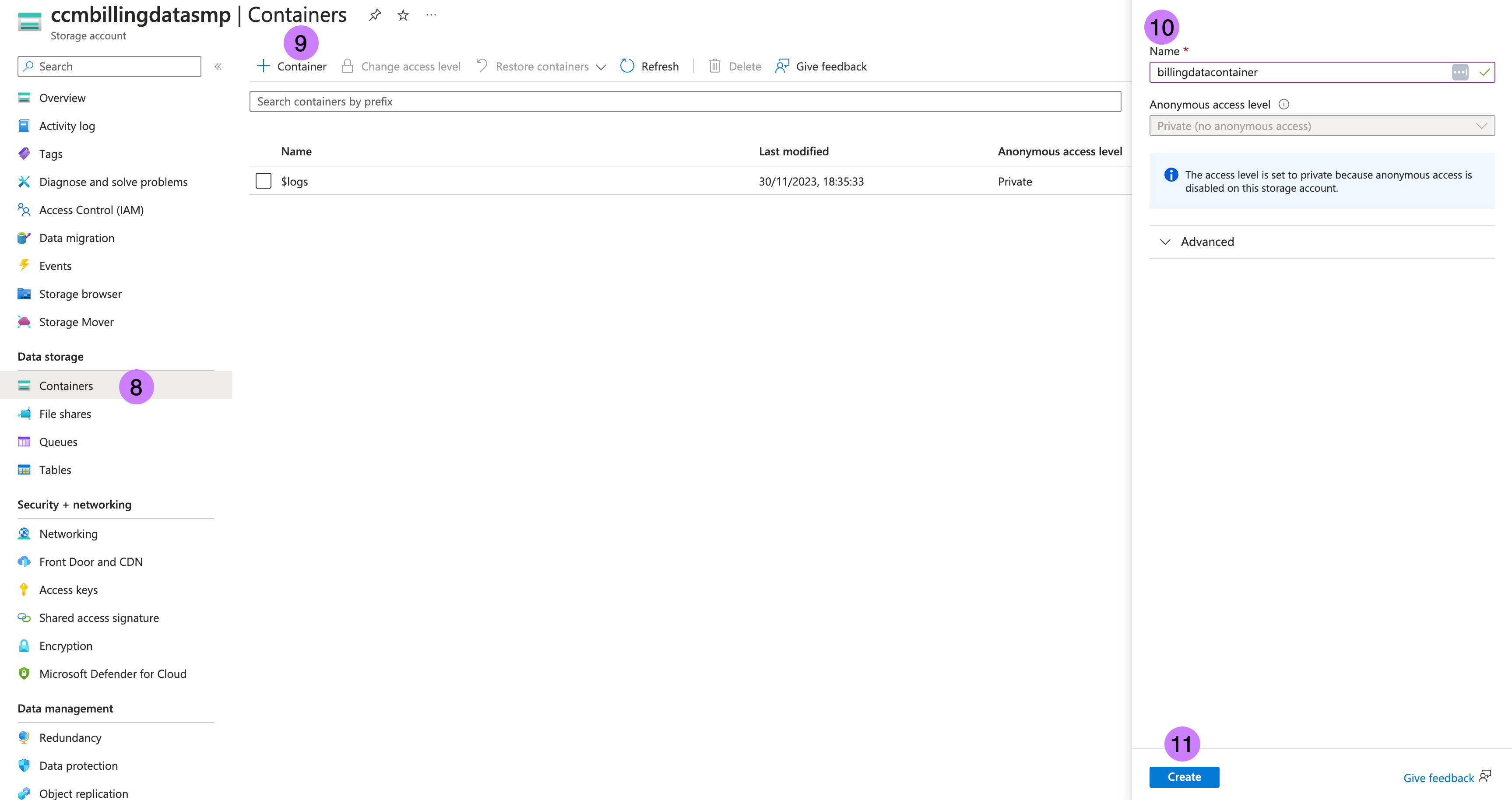 4. Enter Name as billingdatacontainer. Note Name as → containerName