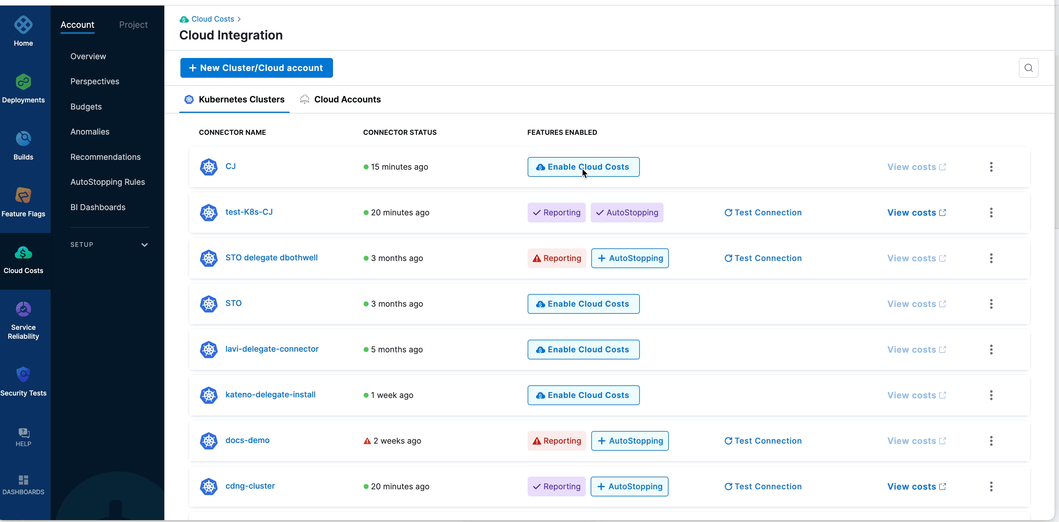 The Cloud Integration page displays the existing connectors for the Kubernetes clusters and the cloud accounts.