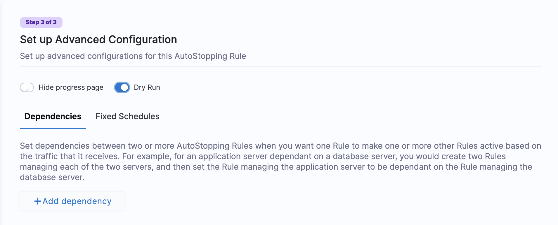 The dry-run mode is a feature that enables you to try out AutoStopping without actually stopping your cloud resources. This option allows you to evaluate the impact of AutoStopping and estimate the costs saved before enabling the feature.
