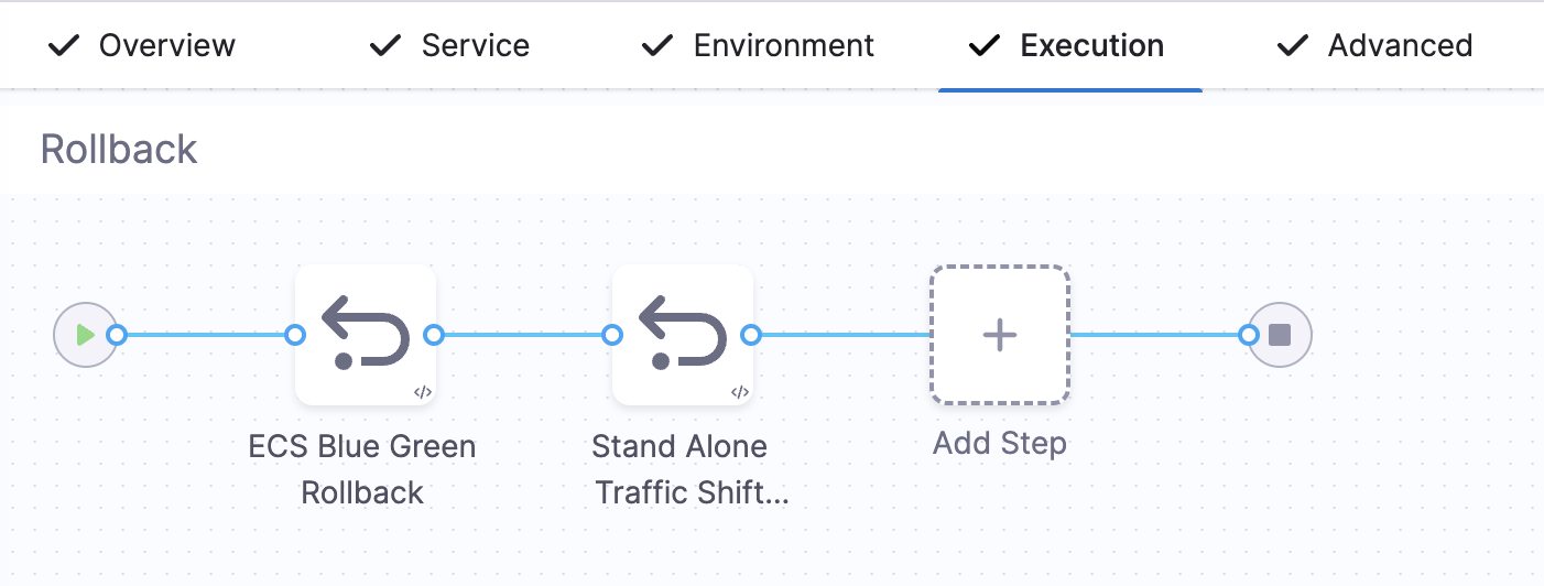 • In Inherit mode, if the step fails mid-execution, the rollback is handled by the ECS Blue Green Rollback step, which restores the traffic weights and blue/green tag assignments using the stored rollback data.