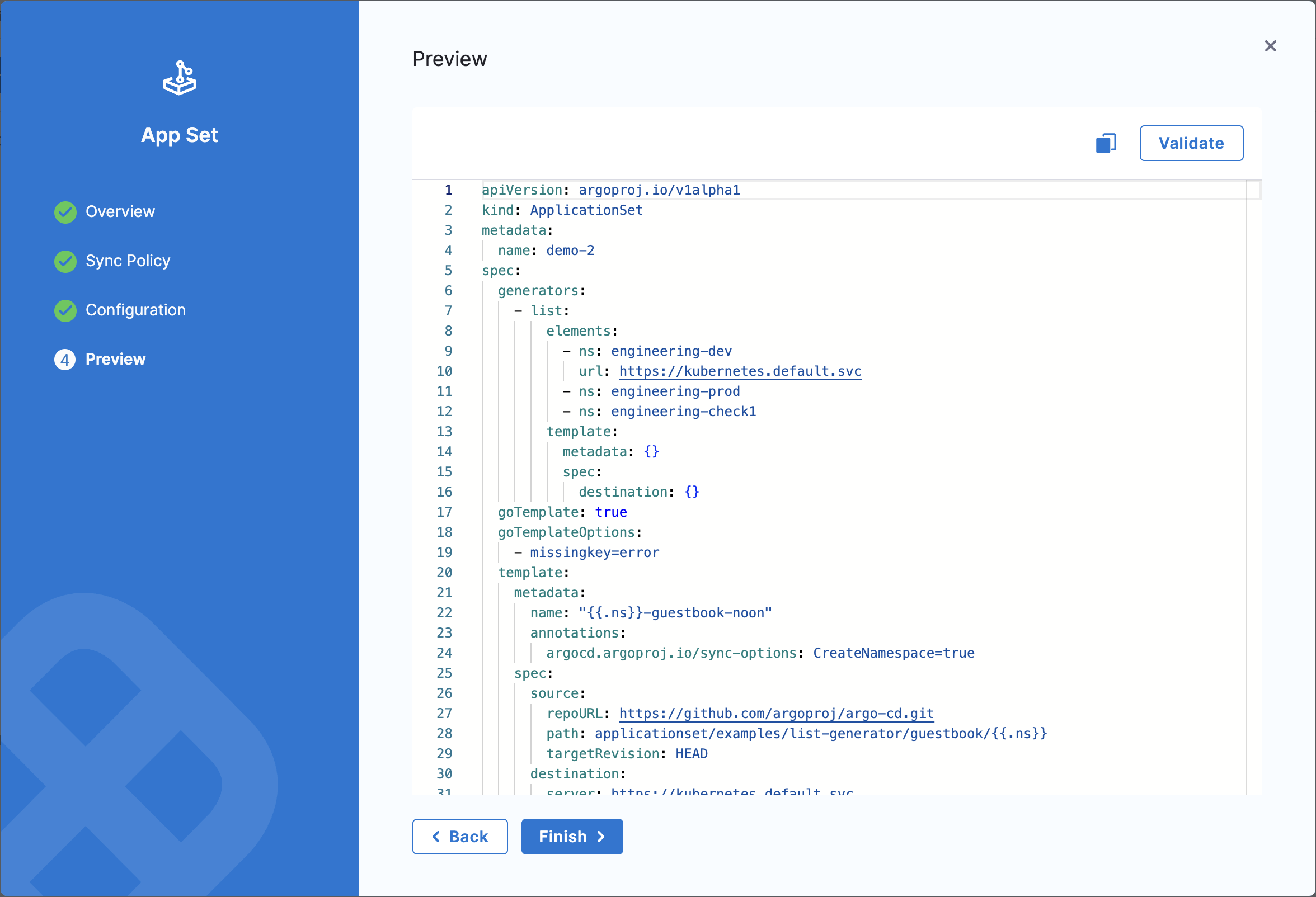 - Click on the Manifest tab to see the complete manifest generated for the ApplicationSet.