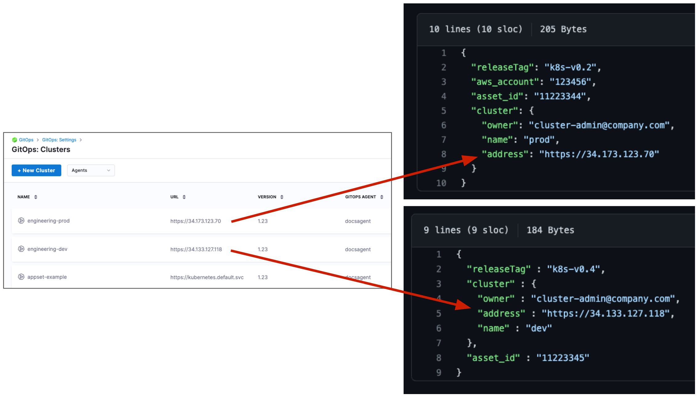 "address": "https://1.2.3.4"with the Endpoint IP address for your dev target cluster. Ensure you use thehttps://scheme.noteThis cluster must be created in Harness beforehand.