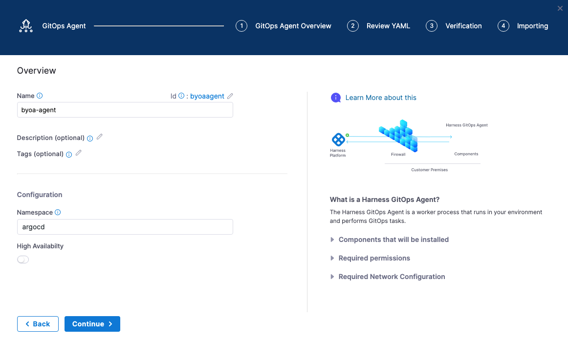 With a standard Harness GitOps Agent installation (non-BYOA), Harness can install and manage Argo CD for you. This scenario is different from a BYOA where you are importing an existing Argo CD configuration into Harness GitOps.