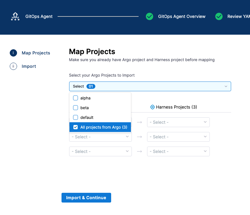 The following steps show you how to install a GitOps Agent into an existing Argo CD namespace and then map your existing projects to your Harness project.