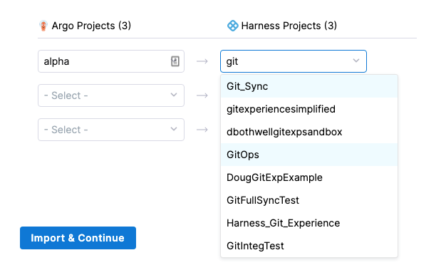 Map the Argo CD project to a Harness project and select Import & Continue. Do not re-map an existing mapping. Harness will throw an error.