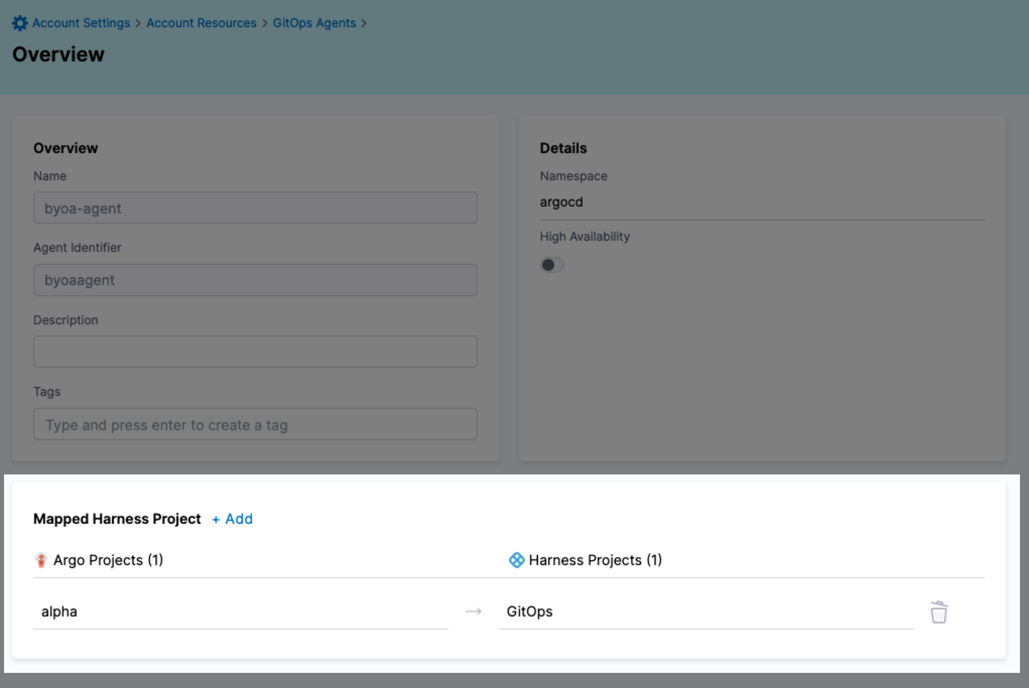 Select Edit. In this example, the Argo CD project alpha is mapped to the Harness project GitOps.