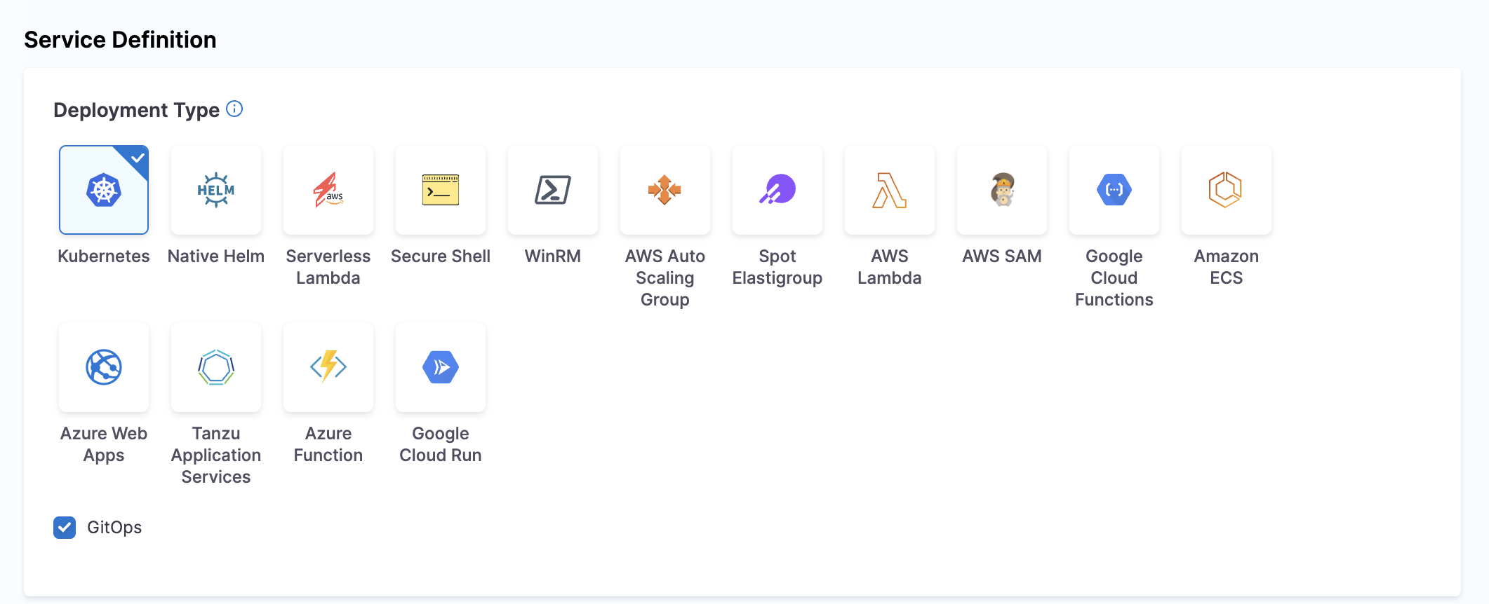 - In the service configuration tab, under the service definition, in the deployment type, select Kubernetes and toggle on Enable GitOps.