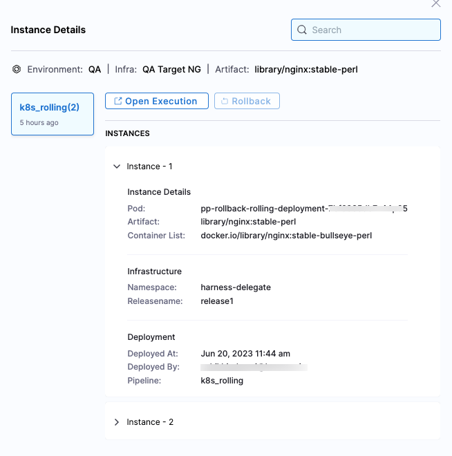 2. Click on View Instance and Rollback. All executions will be displayed along with their environment details. You can only perform a rollback in the Environment view.