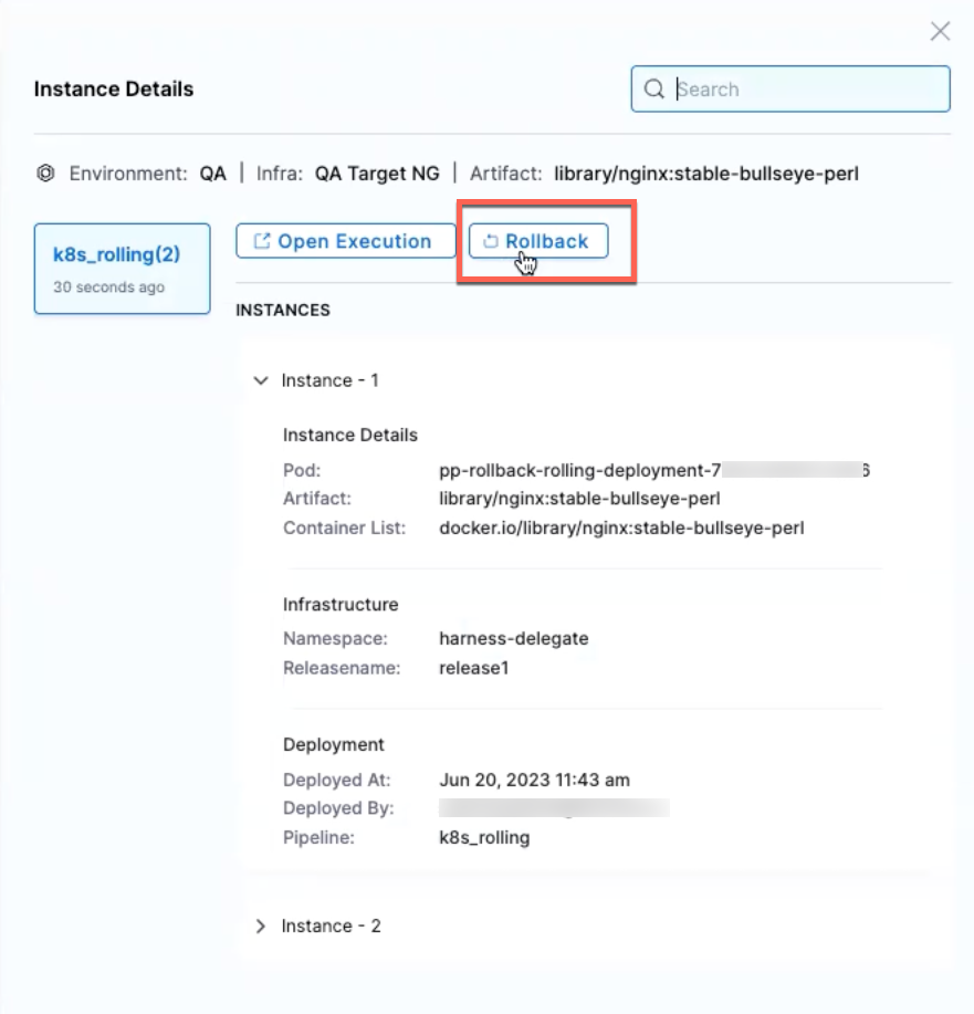 Here, you're rolling back the deployed instance with the artifact library/nginx:stable-bullseye-perl to the previously deployed instance with artifact library/nginx:stable-perl.