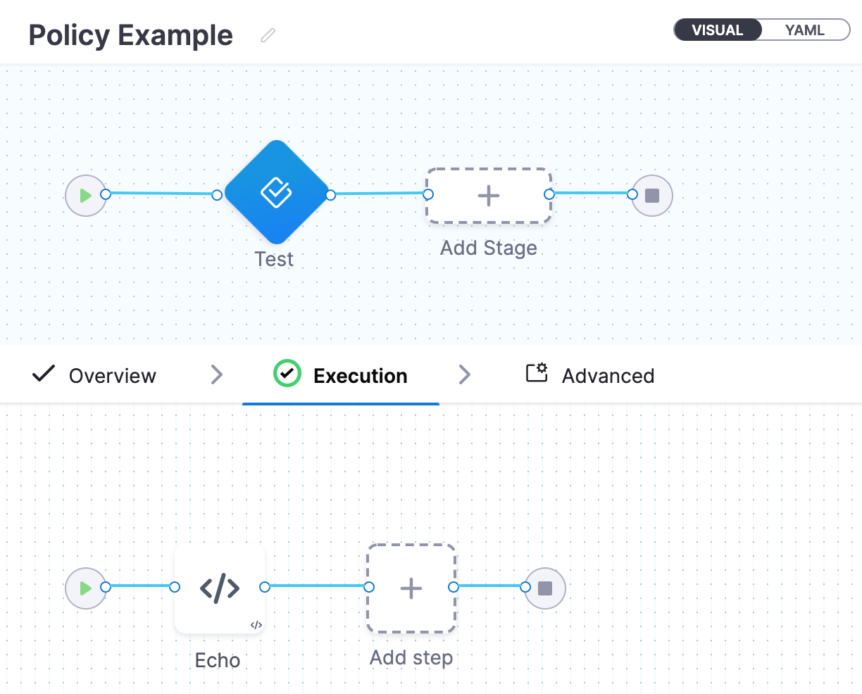 Click Visual and you can see it's a simple Pipeline with a manual Approval stage and one Shell Script step that echoes hello.