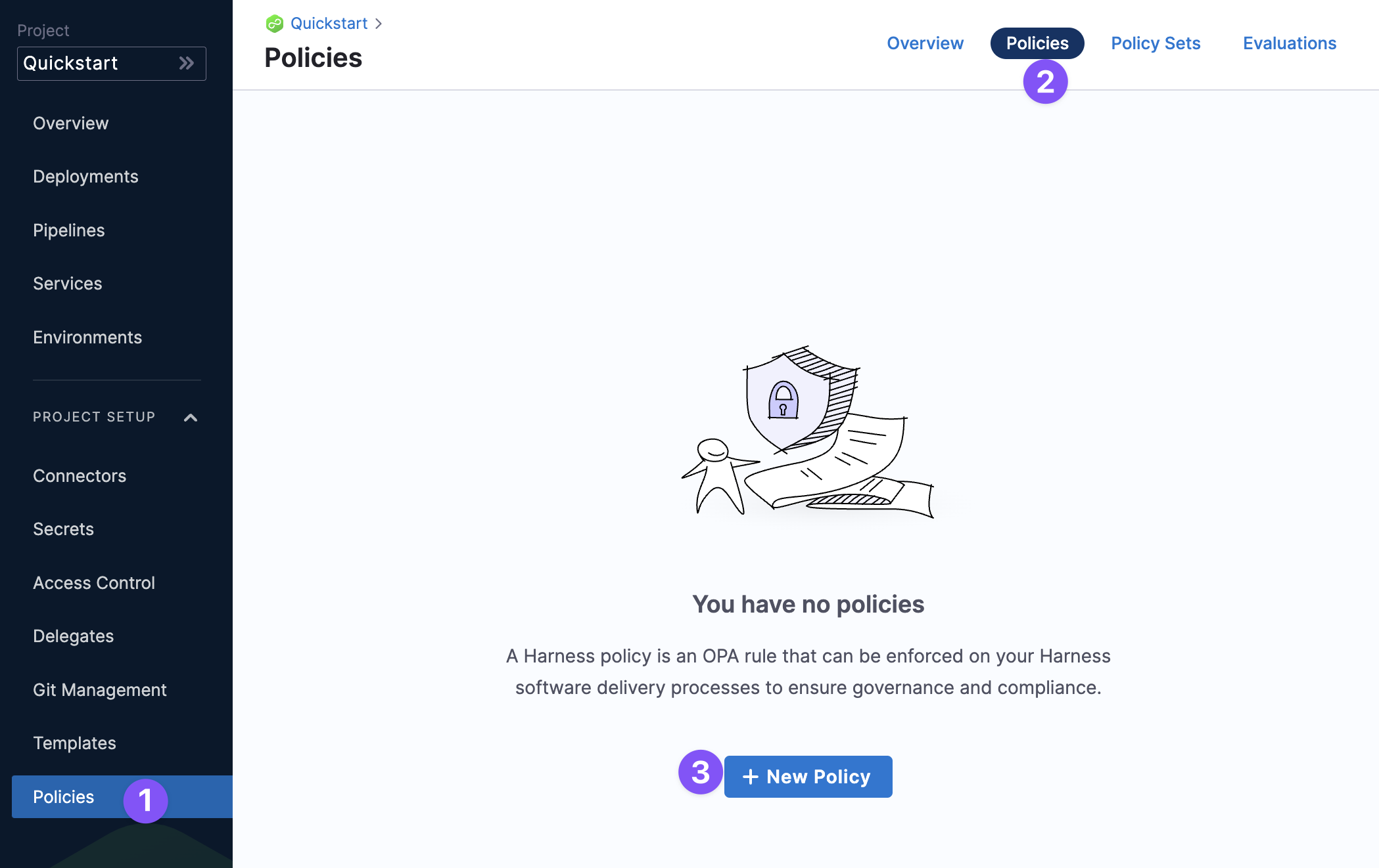 For this quickstart, we'll create a new Harness Project and only apply Policy Sets to its Pipelines. We will not impact Pipelines outside of this Project.