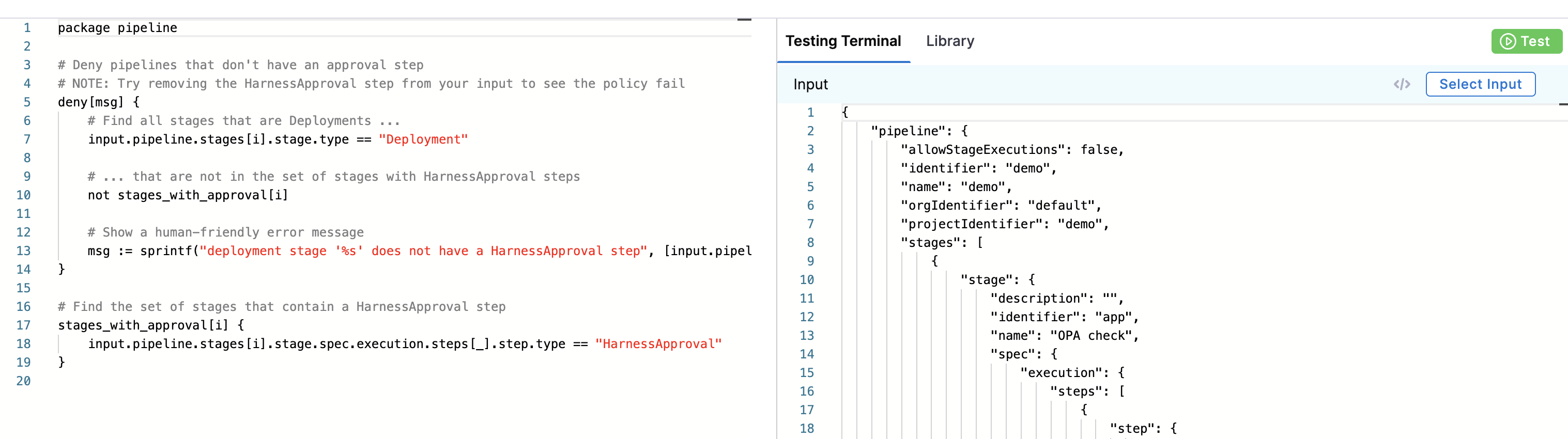 In this step, we'll quickly review a Rego policy, add the policy in Harness, and then test our Pipeline using the policy.