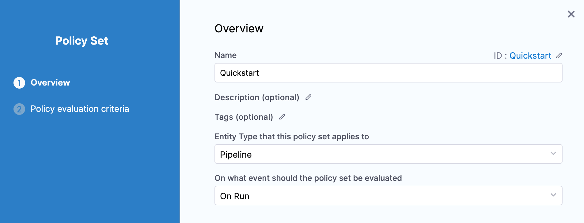 When you create Policy Sets they are applied to all matching entities (for example, Pipelines). Be careful that you do not create a Policy Set that might impact existing Pipelines unintentionally.