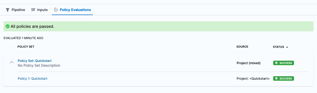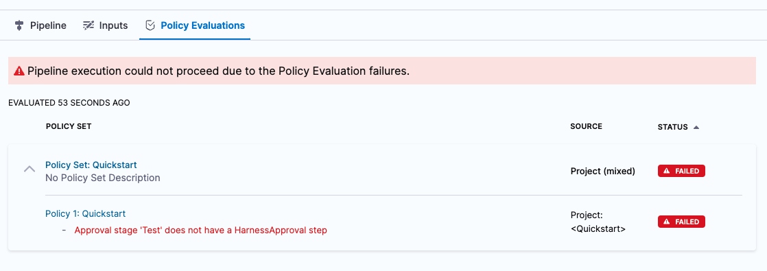 You can see the Policy Set that failed the Pipeline, and the reason for the failure. Clicking the Policy Set name will take you to the Policy Set.