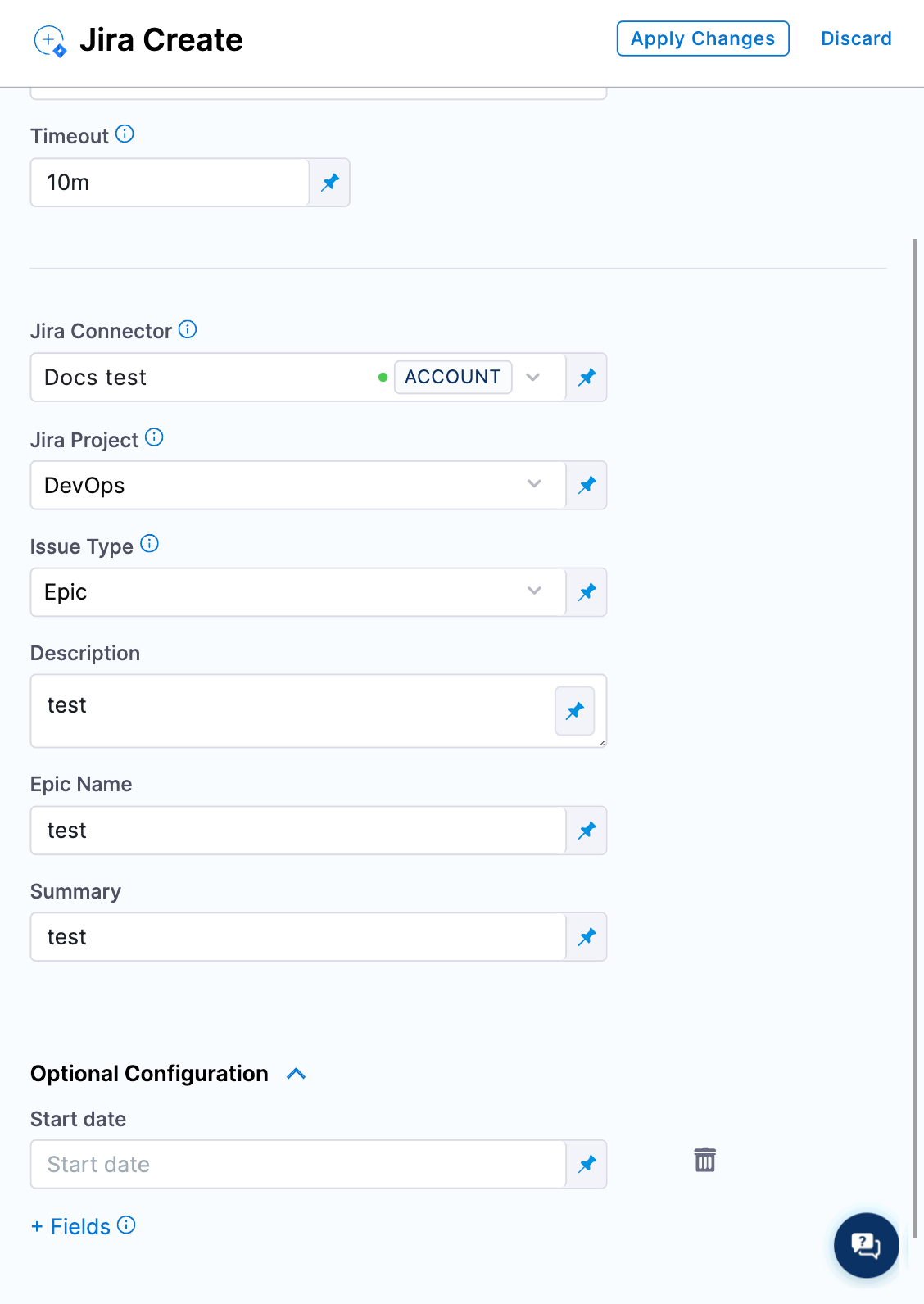 In Timeout, enter how long you want Harness to try to create the issue before failing (and initiating the stage or step failure strategy).