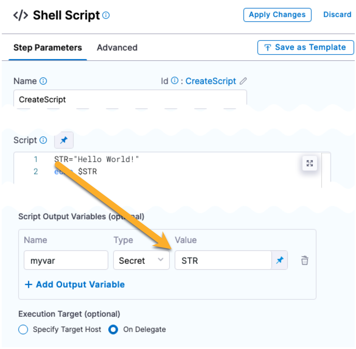 When executing a script, you can also dynamically capture the execution output from the script, providing runtime variables based on the script execution context, and export those to another step in the same stage or another stage in the same pipeline.