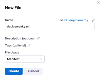 9. Enter the file name deployment.yaml, select Manifest for File Usage, and select Create.