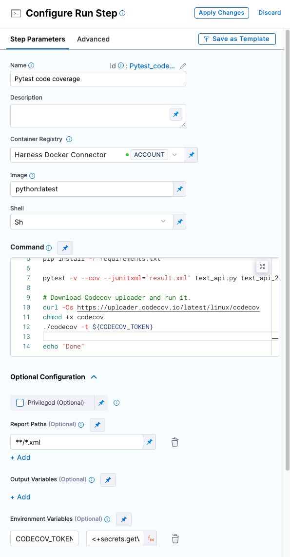 CODECOV_TOKENenvironment variable and set the value to an expression referencing your CodeCov Upload token secret, such as<+secrets.getValue("my_codecov_upload_token")>. -