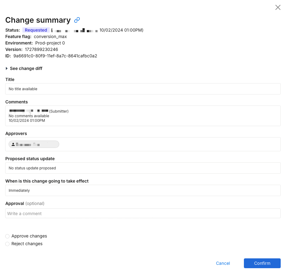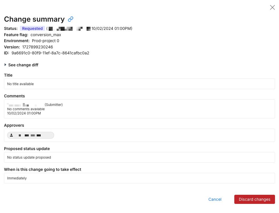 Additionally, you can also change permissions when you click the Review changes button on the Targeting rules page. This takes you to the Change summary page with the option to either click the Skip Approvals & Save link or go through the approval process similar to other users.