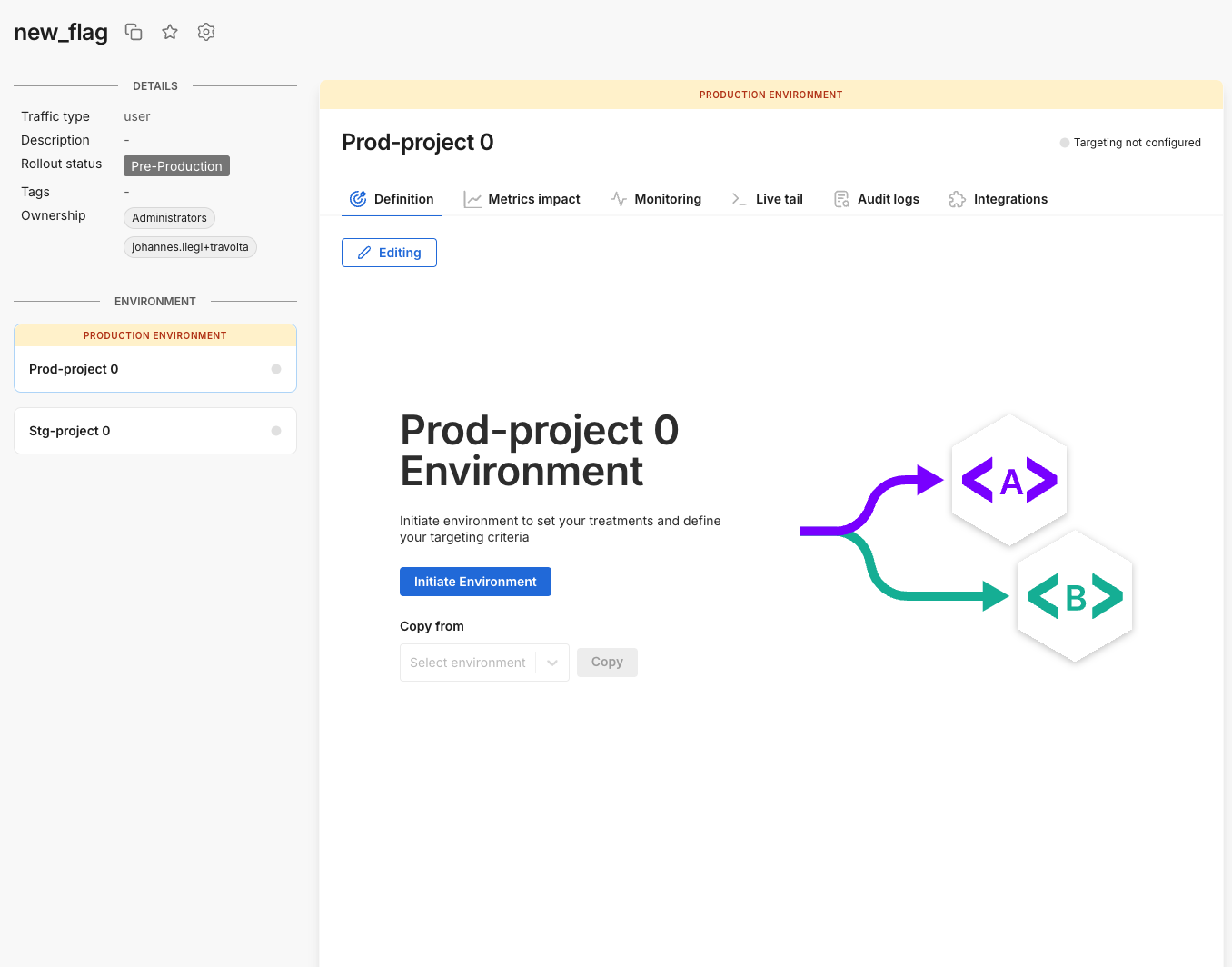 To configure your feature flag for a particular environment, select the environment on the left panel, and click the Initiative environment button within the Definition tab.