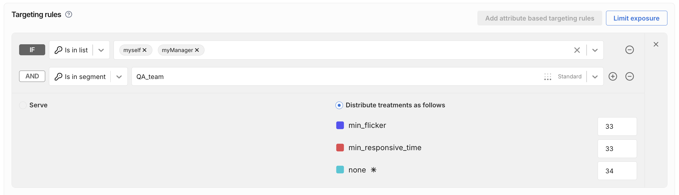 • Click Add attribute based targeting rules to assign individual users or segments to a selected treatment or percentage distribution.