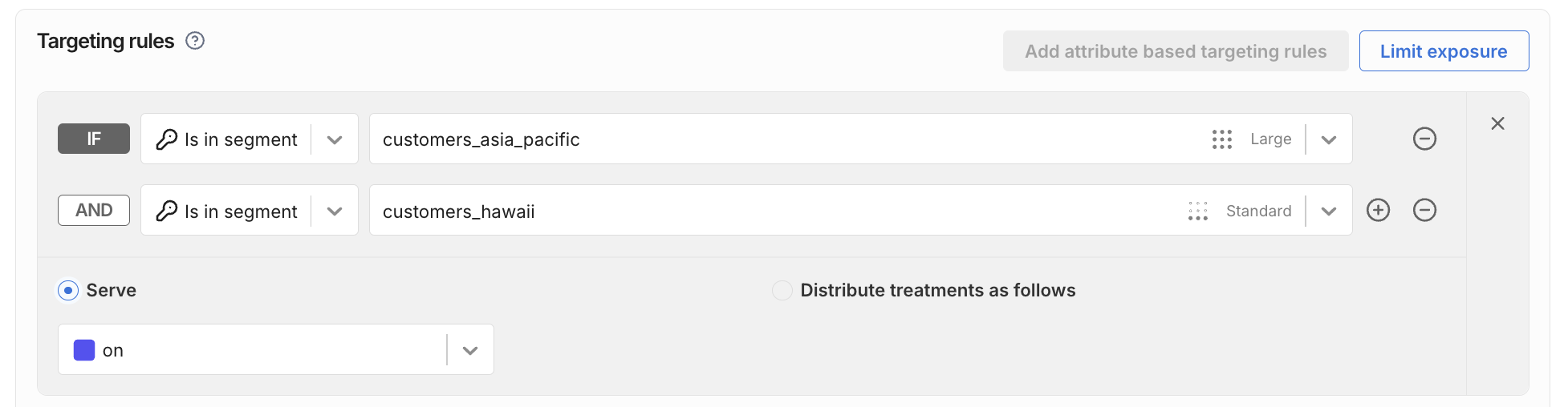 You can target segments in individual targeting rules. These rules assign a treatment to the segment. In the following example, the feature flag will serve on to all user IDs in the given segments.