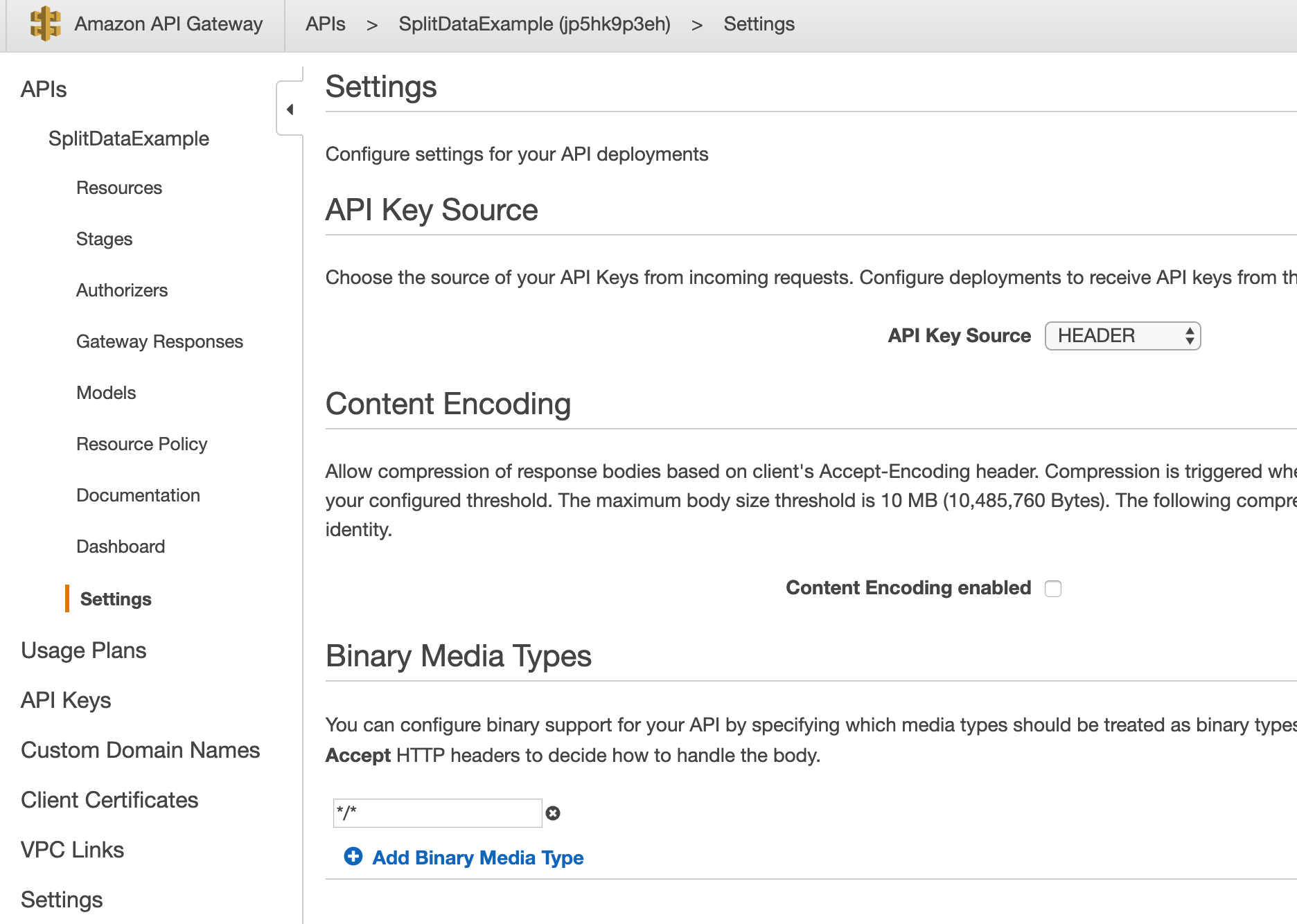 17. Since Split zip the post body when calling the Webhook, we need to enable binary type for our API Gateway, under Settings, add */* in Binary Media Types, and click Save Changes.