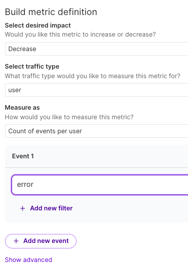 We would want to see fewer errors, so this metric will let us know the effect of a feature flag on the errors that we track with the trackError method.