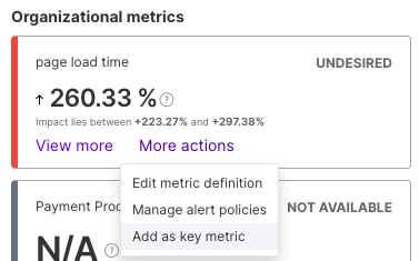 Getting an alert when a metric reaches significance can be as easy as setting the metric as a key metric for a feature flag. This is done on the Metrics impact tab for the feature flag by clicking on the More Actions button and selecting Add as key metric.