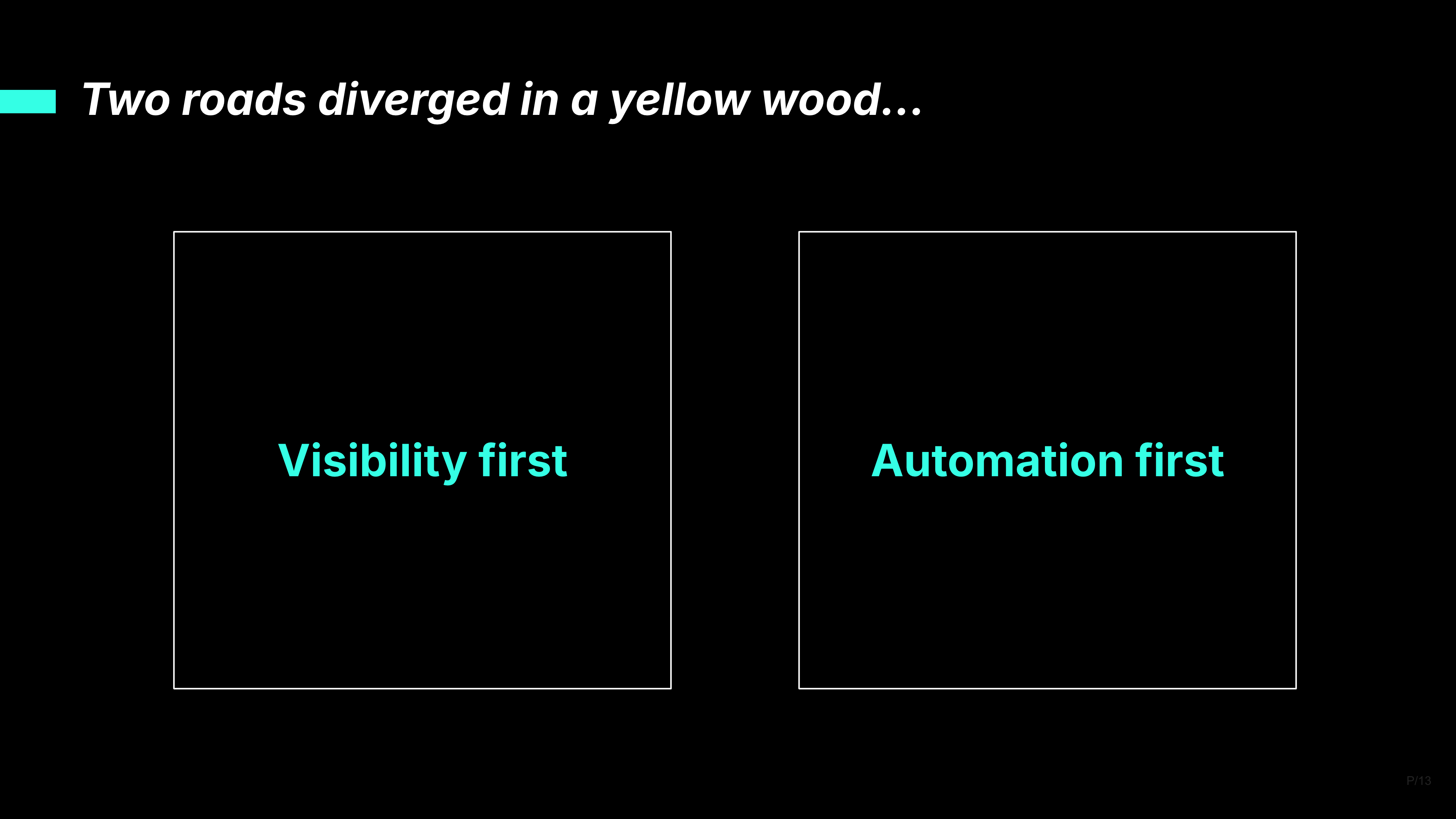While all roads lead to Rome, we have seen that customers who are “Automation-first” have higher chances of succeeding. The barrier to entry for an automation-first adopter is much, much lower because you can solve individual use-cases in a progressive manner. But since the barrier to entry is so low, these use-cases are not sticky. For example if you have provided one way to create an infrastructure, you can be pretty sure that the same developer is not creating infrastructure every other day.