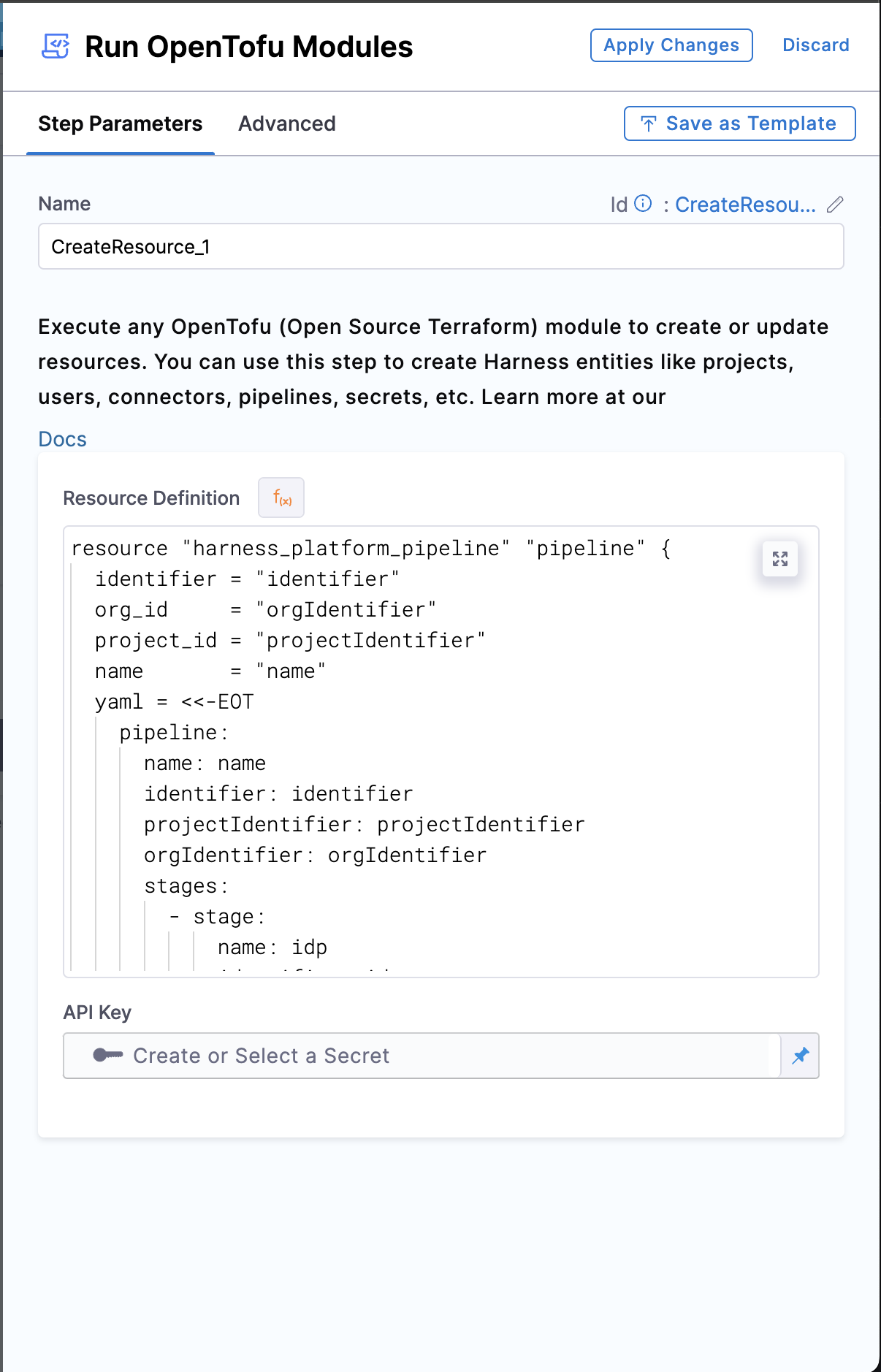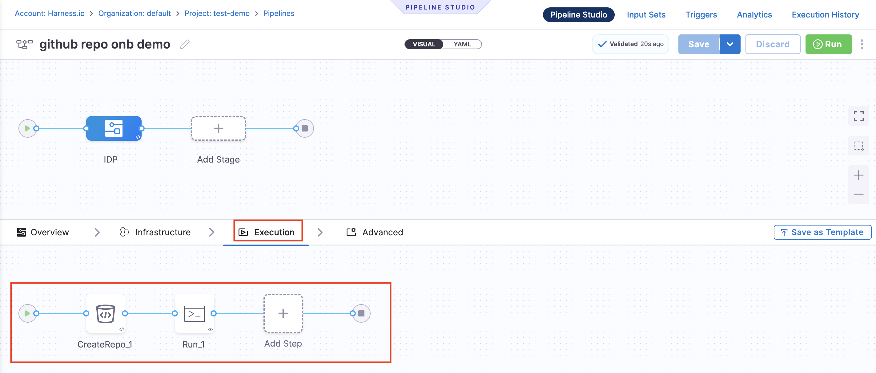 Harness IDP includes a native IDP Stage where all IDP-specific tasks required for pipeline execution are pre-configured as pipeline steps within the stage. This enables quick and efficient creation of self-service workflows.