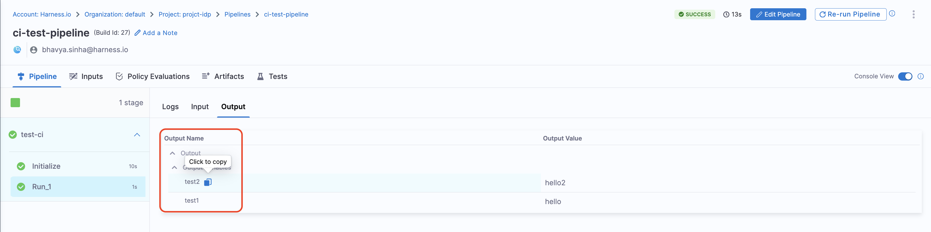 pipeline.stages.testci.spec.execution.steps.Run_1.output.outputVariables.test1is derived from:<+pipeline.stages.testci.spec.execution.steps.Run_1.output.outputVariables.test2>