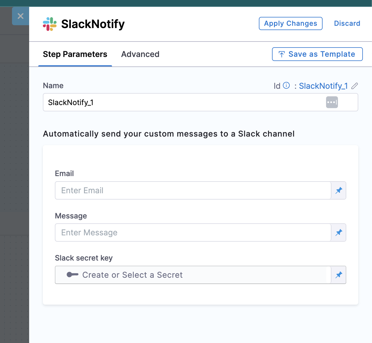 Before adding the execution steps, we need to create some pipeline variables with runtime inputs, which will be used as expression inputs in various steps during execution.