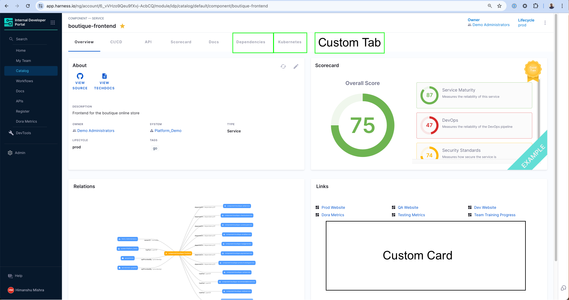 Every page that exists in the Software Catalog e.g. service, API, library, system etc. is uniquely designed to show the most relevant information to the developer for the particular type of application they are viewing. The views are powered by out-of-the-box components like the About card, Scorecard as well as the Plugins that are configured.