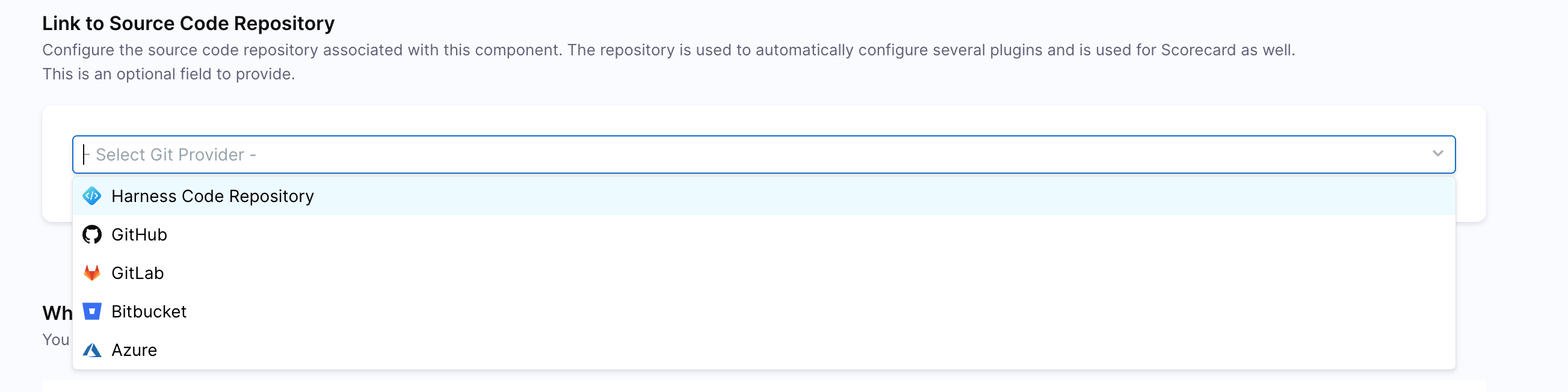 When you select a Git provider from the dropdown and specify the repository, IDP stores the information in the component definition and uses it to power various integrations, including STO vulnerability correlation.