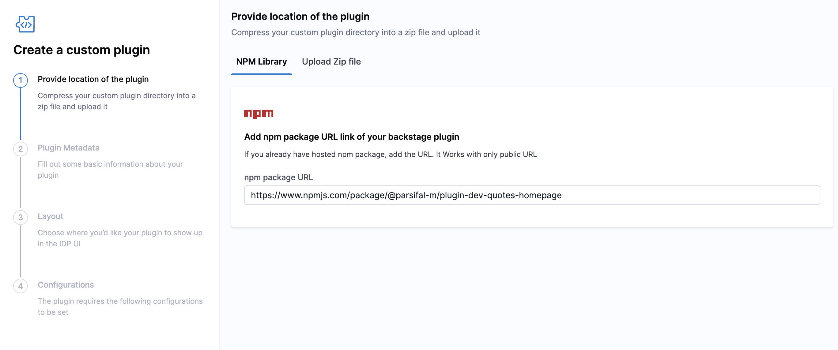 • Package name : This will be same as your plugin package present in your plugin's package.json file. Make sure the name is exactly similar to what's mentioned in the package.json including @, e.g.: @parsifal-m/plugin-dev-quotes-homepage
