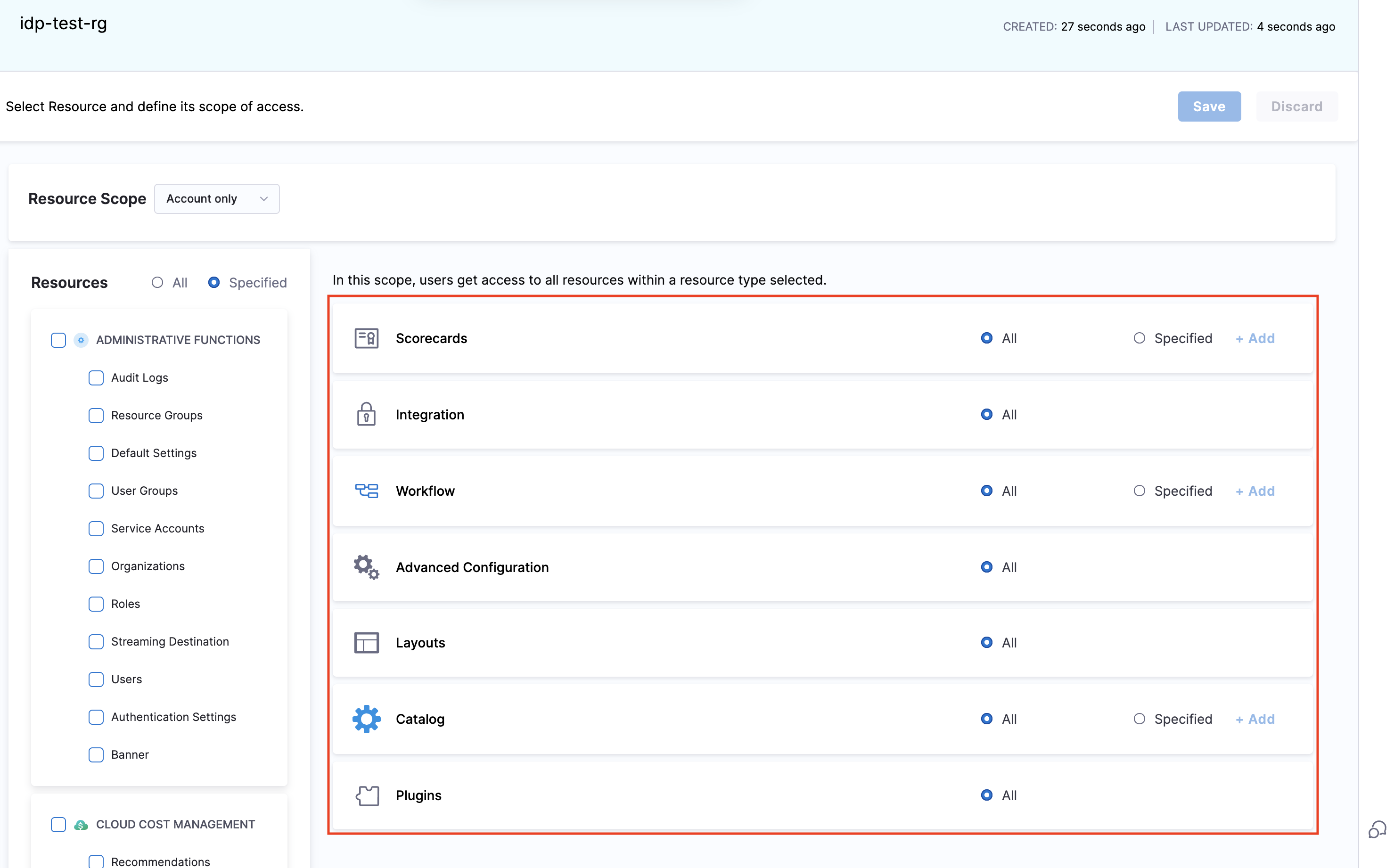 All IDP resources can exist at different scopes, but their permissions and access levels depend on the RBAC settings you apply. With granular RBAC, you can use predefined roles or define custom roles with specific permissions and organize them into reusable resource groups. These permissions are fully aligned with the existing Harness RBAC framework.