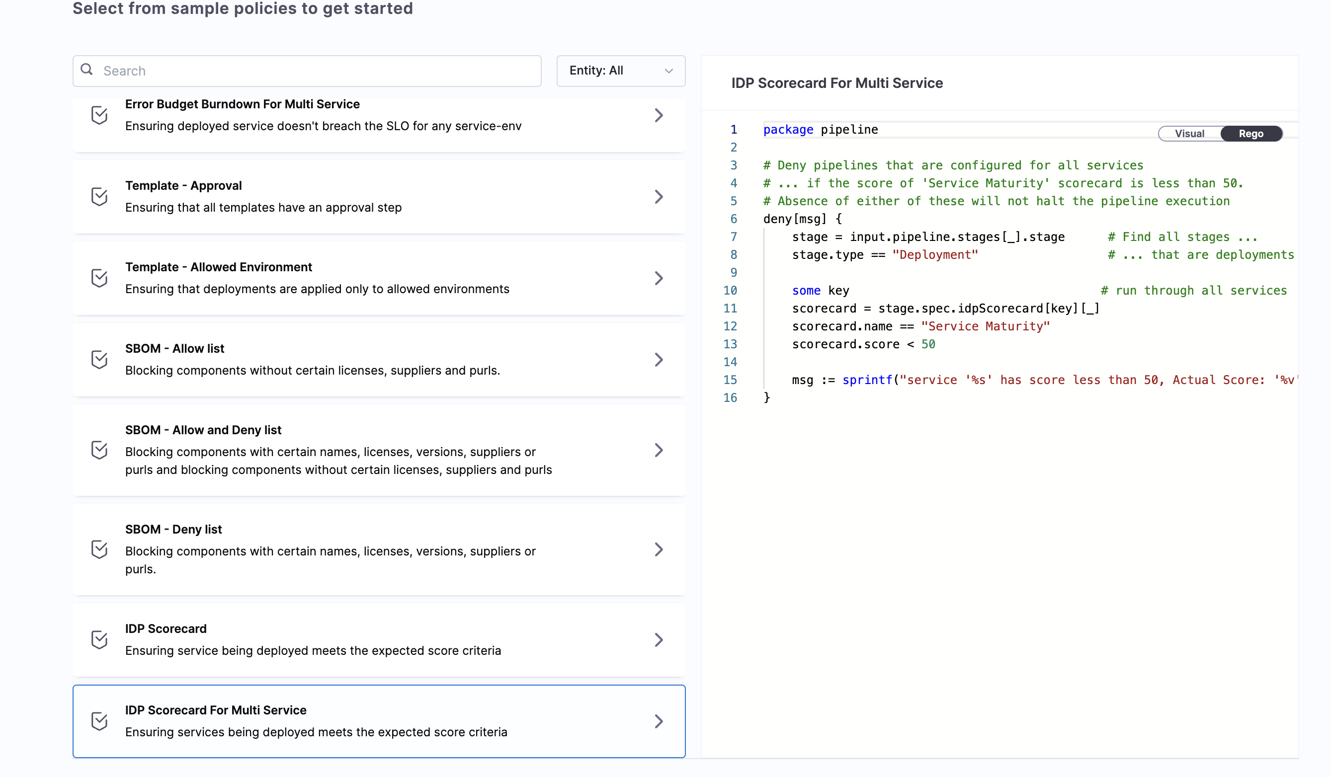 In this tutorial, you learned how to use Harness Policy As Code with OPA to enforce governance rules based on scorecard scores. By creating policies and policy sets, you can ensure that services meet quality standards before pipelines are saved or deployed.