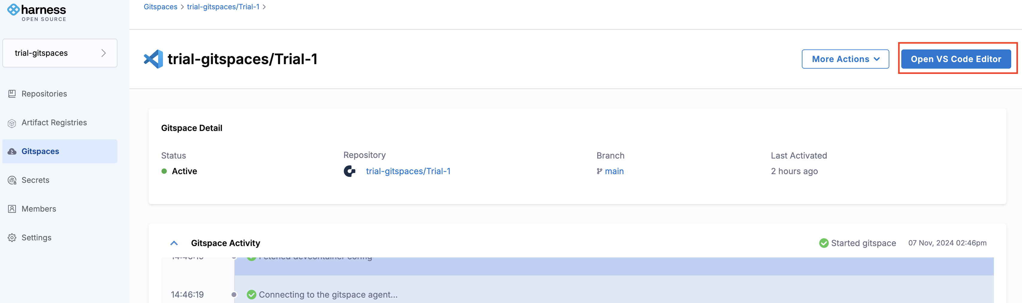 2. After the Gitspace is created, click "Open VS Code Editor" from the Harness Open Source UI.