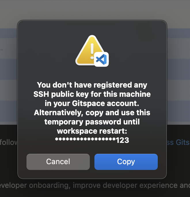 5. To establish this remote connection, a temporary password will be generated automatically. After the Gitspace is created, you'll be prompted to copy the temporary password. Paste it and follow the prompts to establish the remote connection.