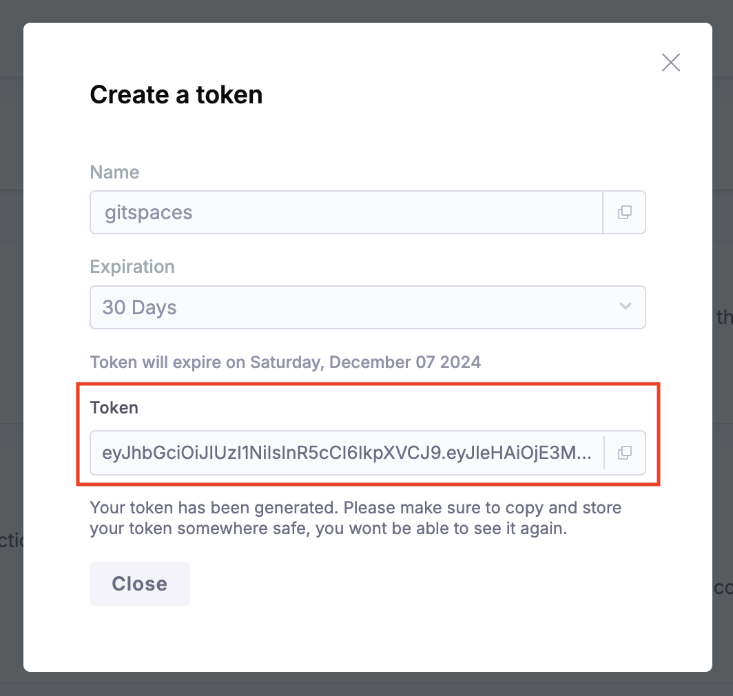 4. From there, create a new token by giving it a name and setting its expiration. Once created, copy the token from the provided box. Please ensure you store this token securely, as you will not be able to view it again.