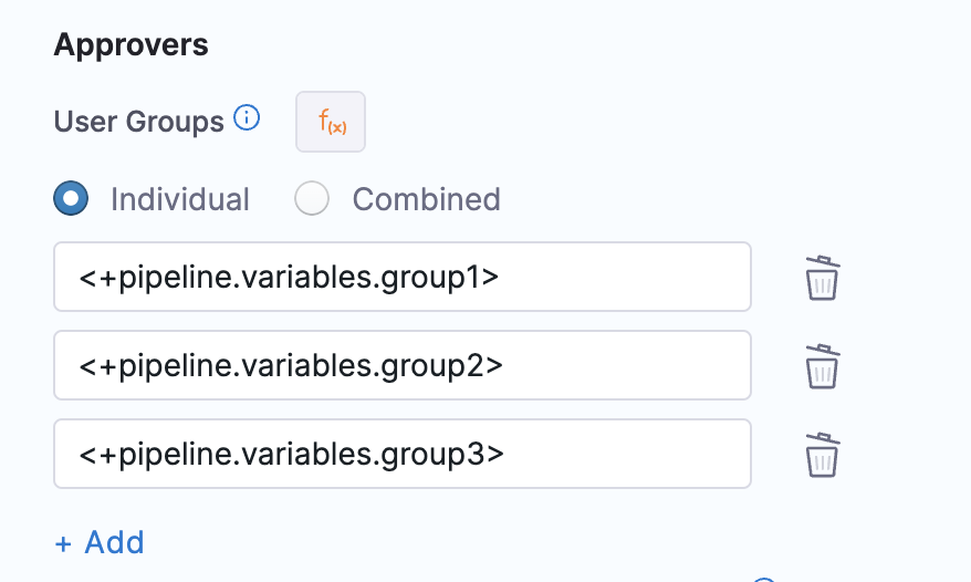 • Individual: Specify individual expressions for each user group that needs to be configured as an approver. Select Add to add more user groups.