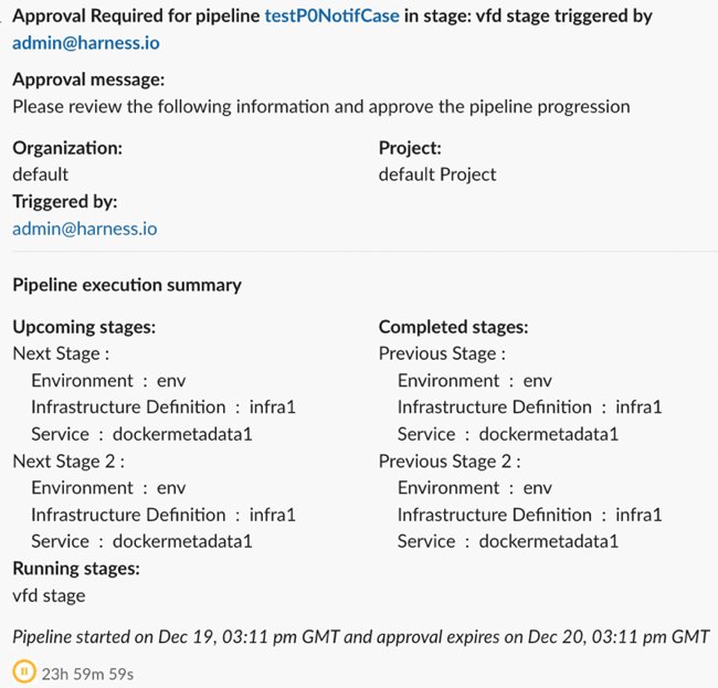 1. Approval Required: A notification is sent when the approval step starts containing the pipeline name, execution URL, user who triggered the pipeline, stage name, approval message, organization and project details, pipeline start time, and the time left in approval expiry.