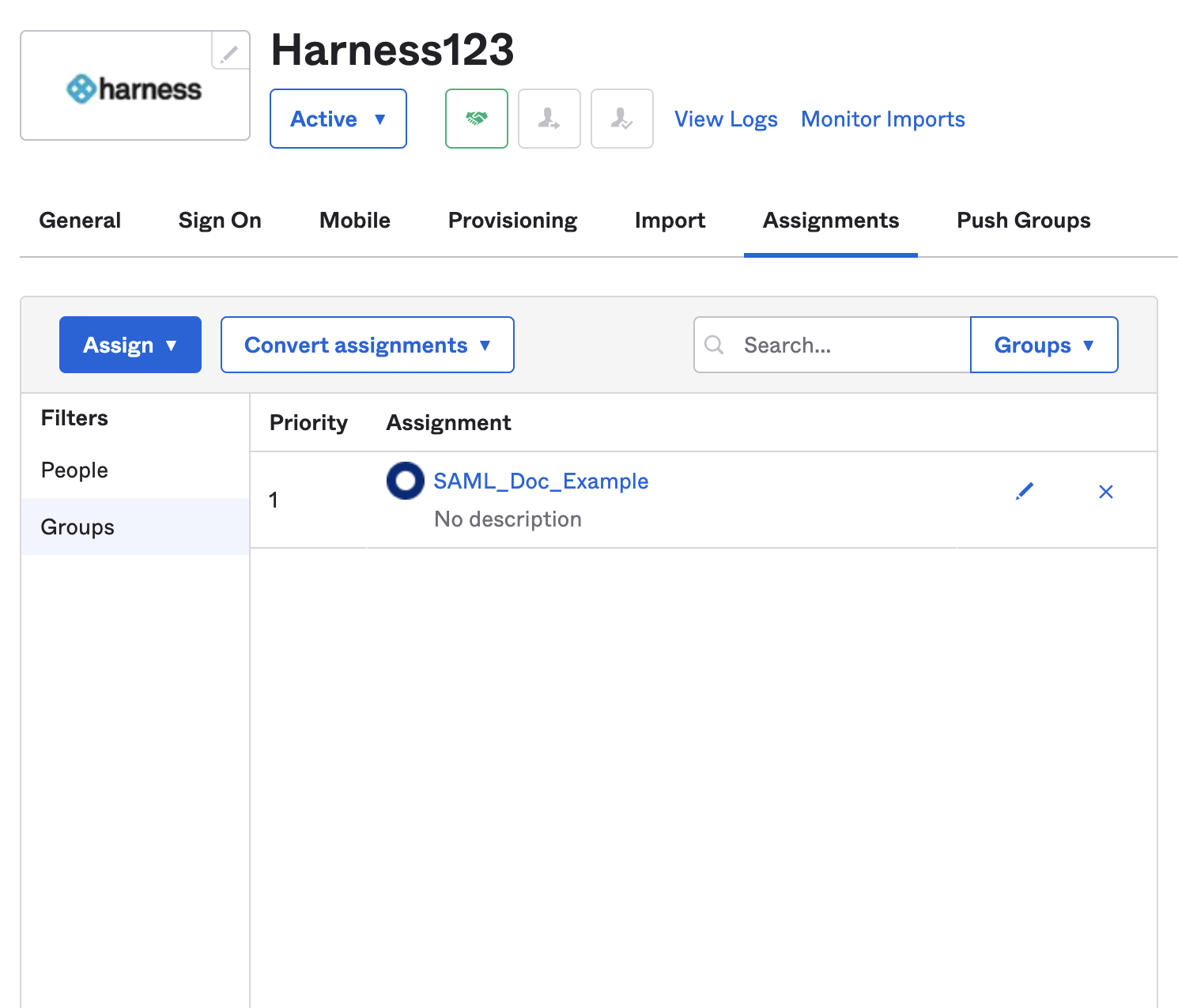 To set up a SAML support in your Okta Harness app, ensure that the app has corresponding Users in Harness: