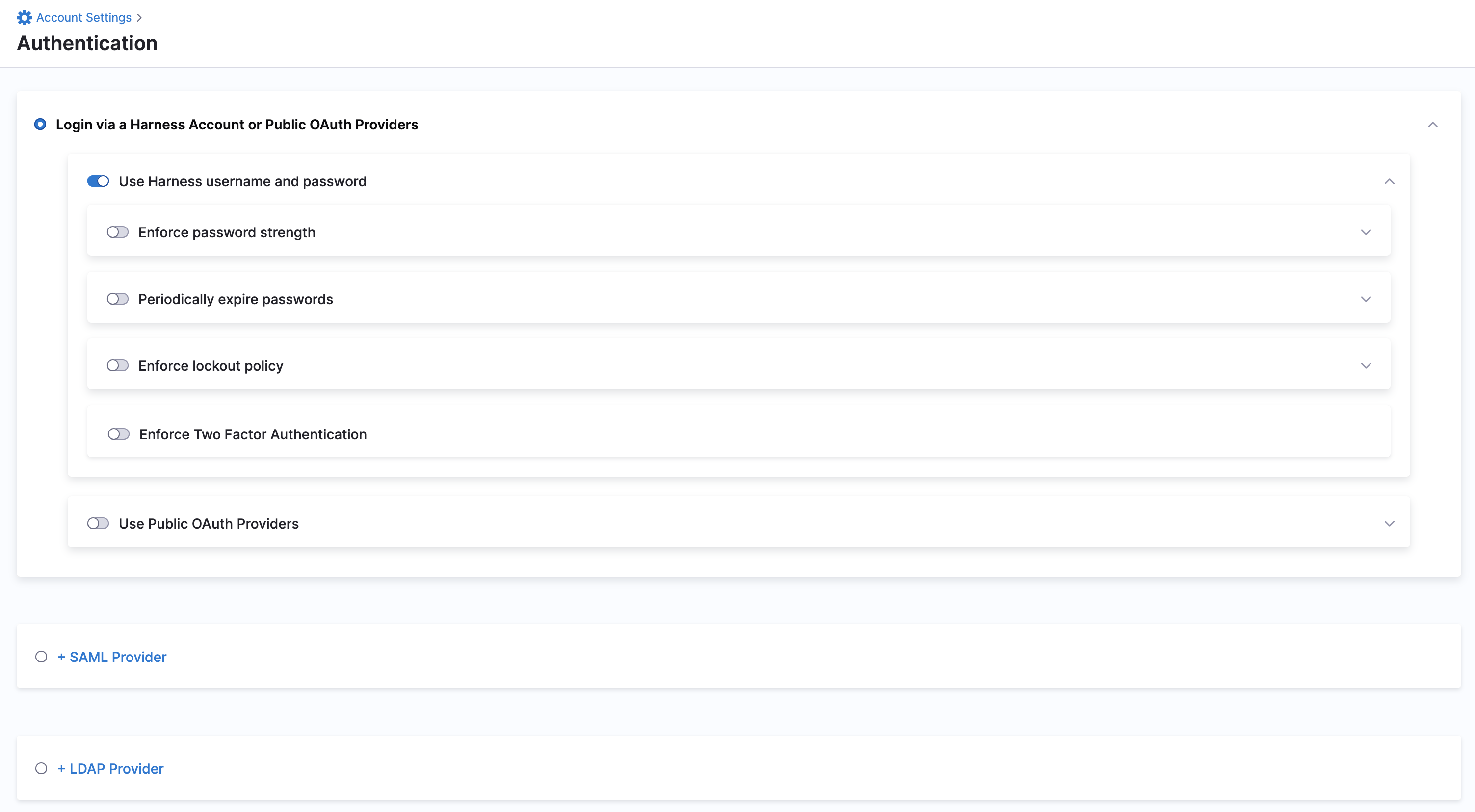You can disable Local Login using the feature flag DISABLE_LOCAL_LOGIN. Contact Harness Support to enable the feature flag.