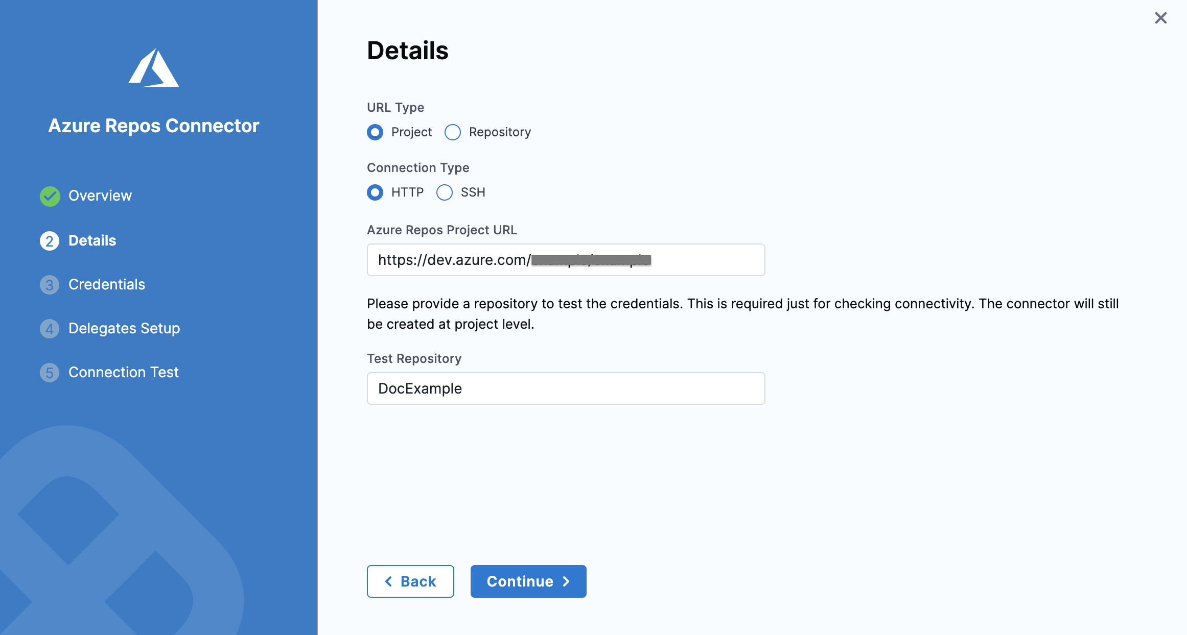 7. If you selected Project, in Test Repository, enter the name of a repository that Harness can use to test the connector's connection.