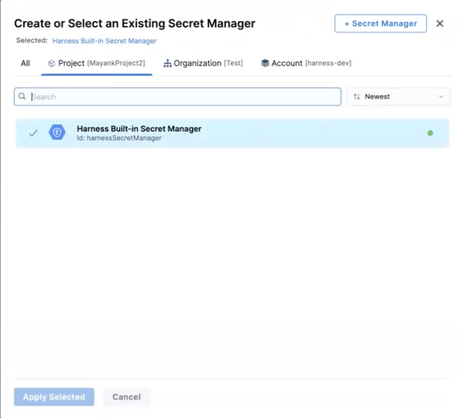 When you create a secret, Harness shows the list of secret managers at the parent scope and up the hierarchy. If you create a secret at the project level, Harness lists all secret managers scoped at the account, org, and project levels.