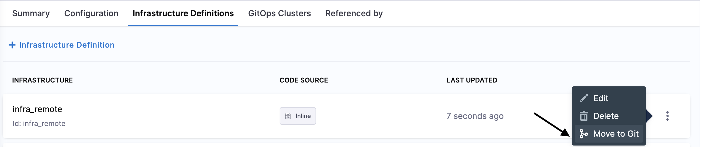 Select an environment, and then select the infrastructure definition you want to store in your Git repo.